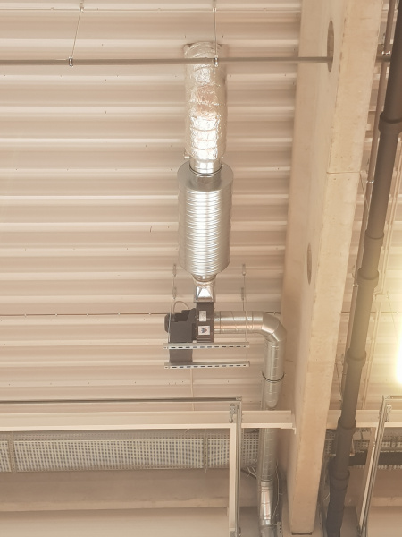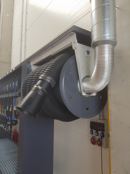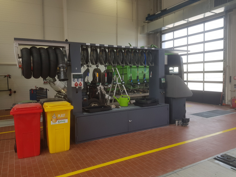Realisierung der Abgasabsaugung. Auf Serviceständern platzierte Aufroller für die Ausgabe von Betriebsflüssigkeiten. Absaugrohre im Boden installiert und zu Absaugventilatoren unter dem Dach des Gebäudes geführt. Realisierung inkl. kompletter Elektroinstallation.