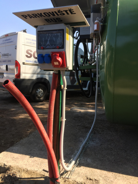 Betriebsinterne Tankstelle für das Nationalgestüt Kladruby nad Labem. Vollmetall-Doppelwandtank mit elektronischer Messung des Zwischenraums. Dieselausgabe über eine Zapfsäule mit elektronischer Erfassung und Datenübertragung an einen PC.