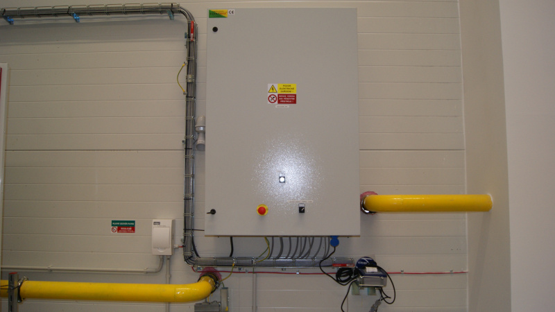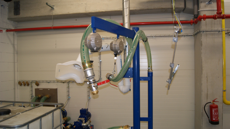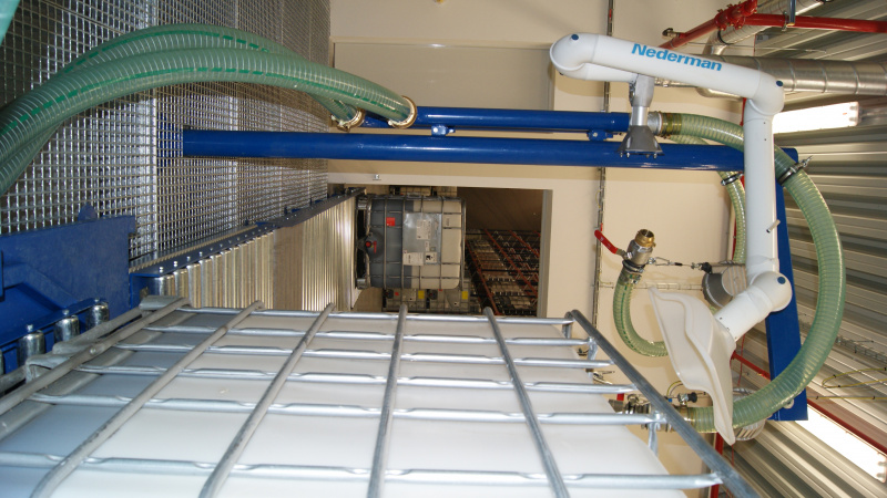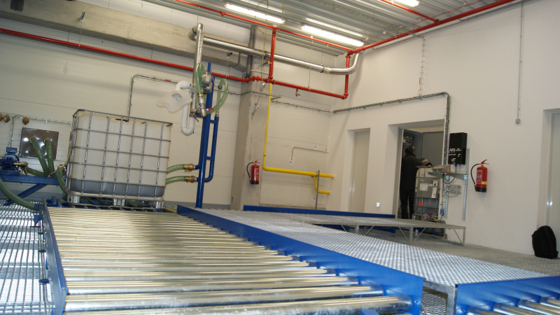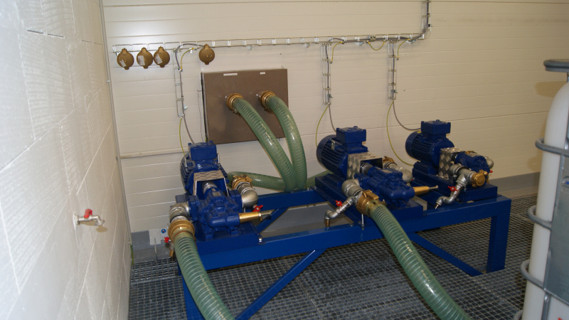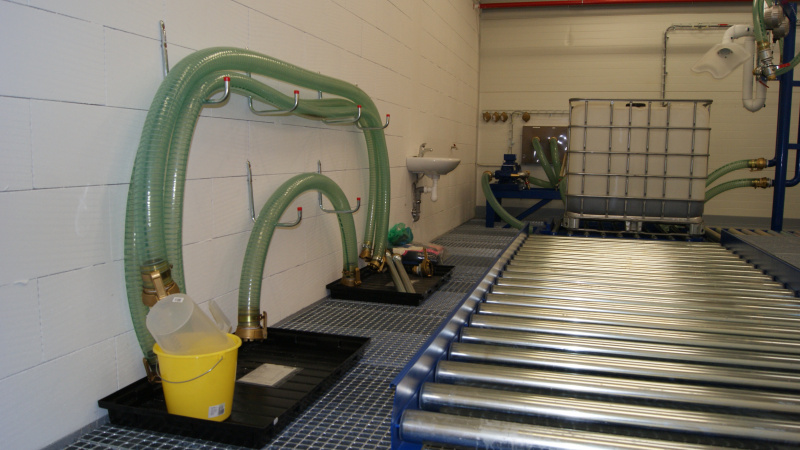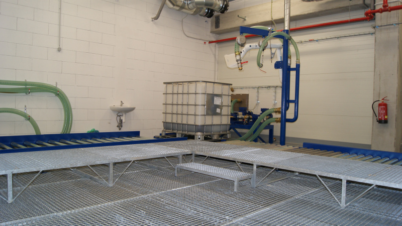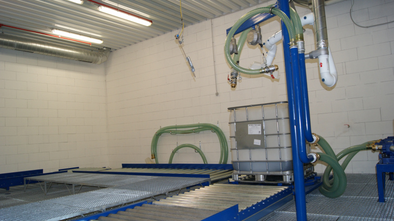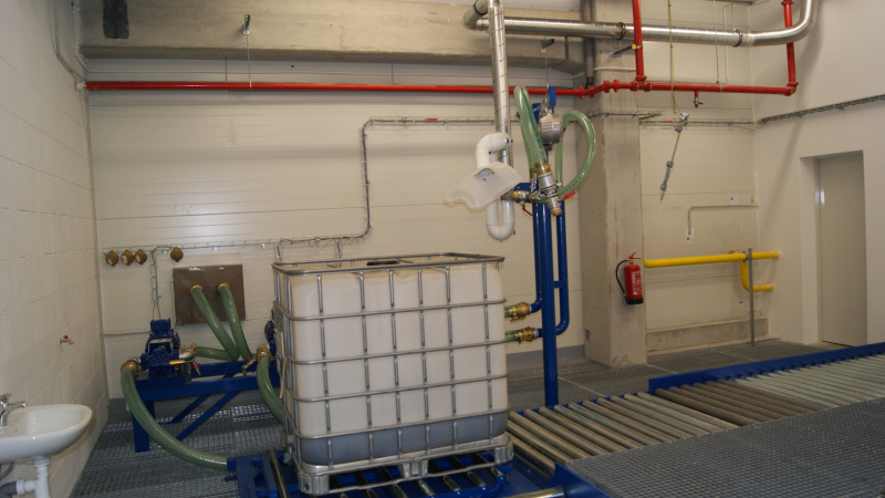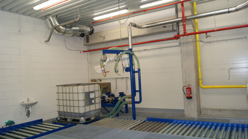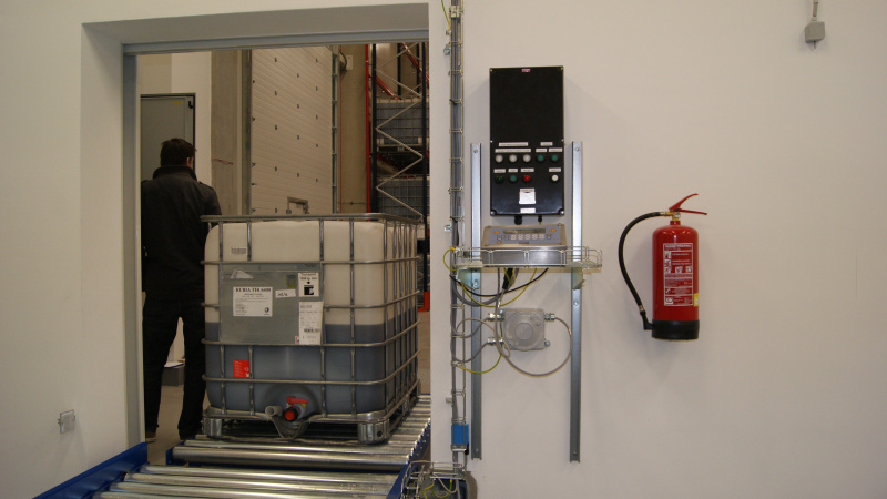 Realisierung einer Abfüllanlage für Öle im Lager von ND Logistic. Die Abfüllung der Öle erfolgt auf einer Rollenbahn zum Transport der IBC-Container. Die Anlage ist mit leistungsstarken Elektropumpen zum Abfüllen von Ölen und Lösungsmitteln ausgestattet. Das System verfügt über eine zertifizierte Waage, die das Abfüllen automatisch beendet, sobald die gewünschte Menge erreicht ist, und das System für das Abfüllen des nächsten Containers vorbereitet. Das System ist außerdem mit einer Absaugung für mögliche Dämpfe und deren Filterung ausgestattet. Lieferung inkl. kompletter Elektroinstallation.