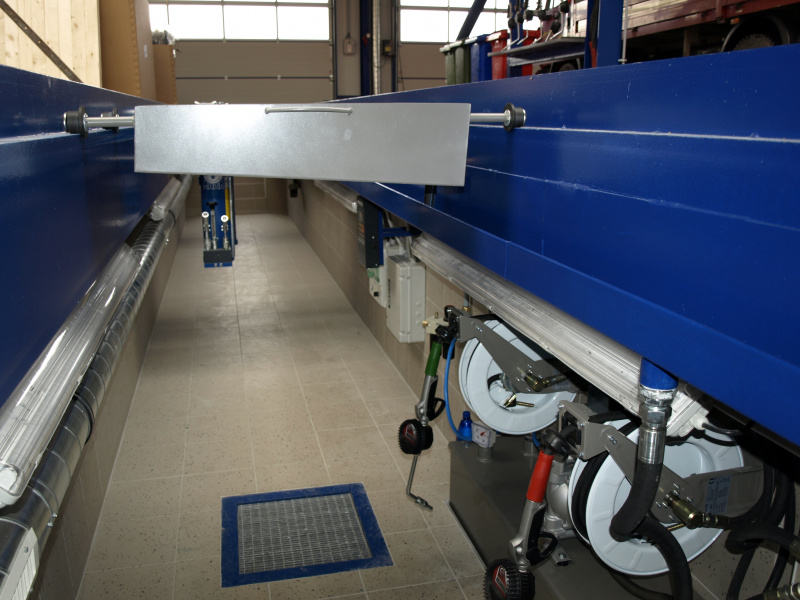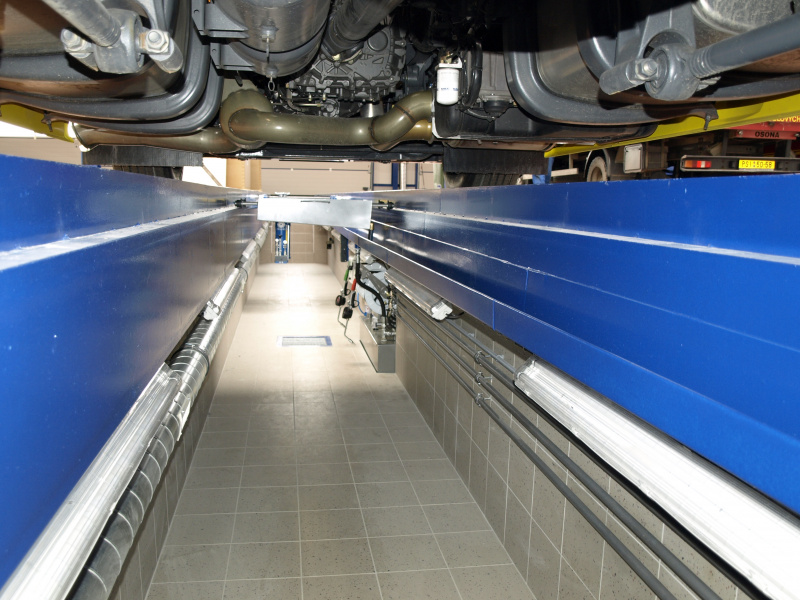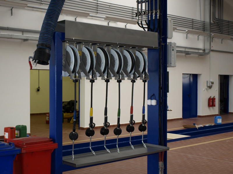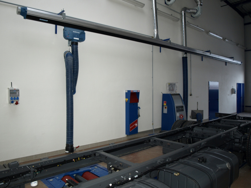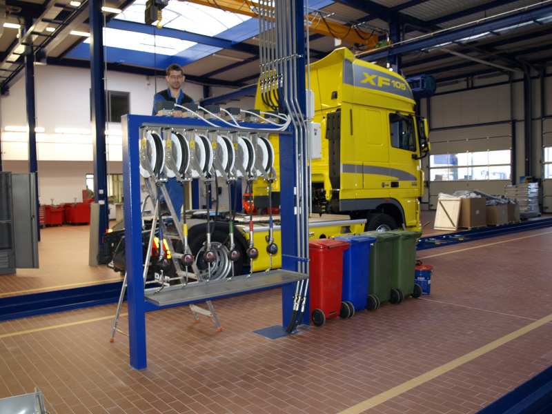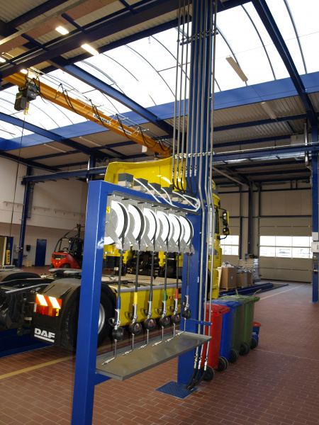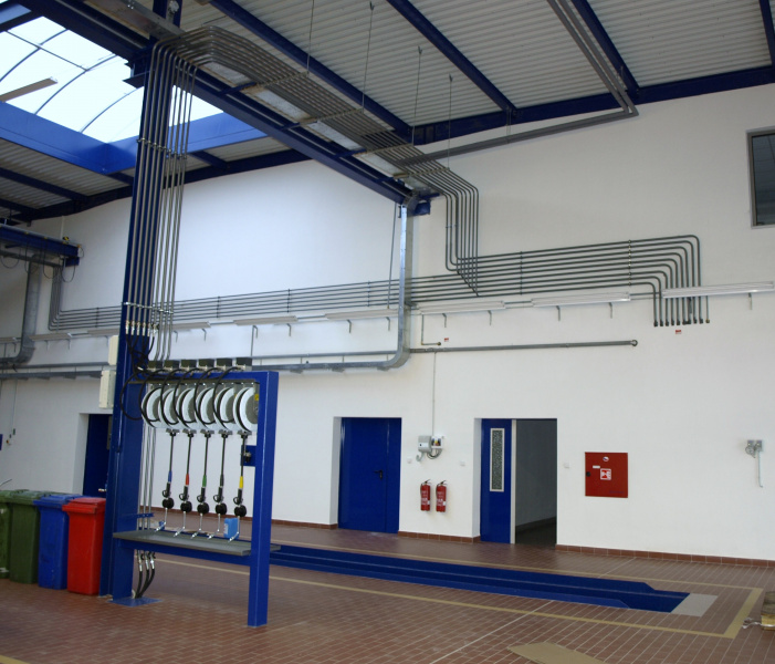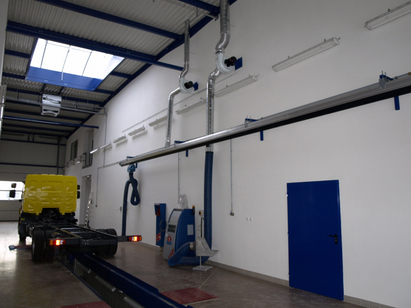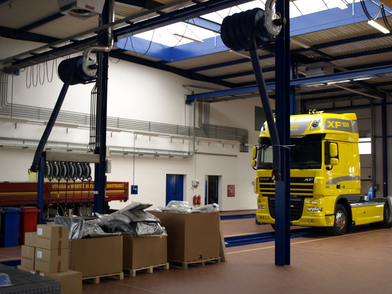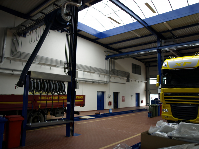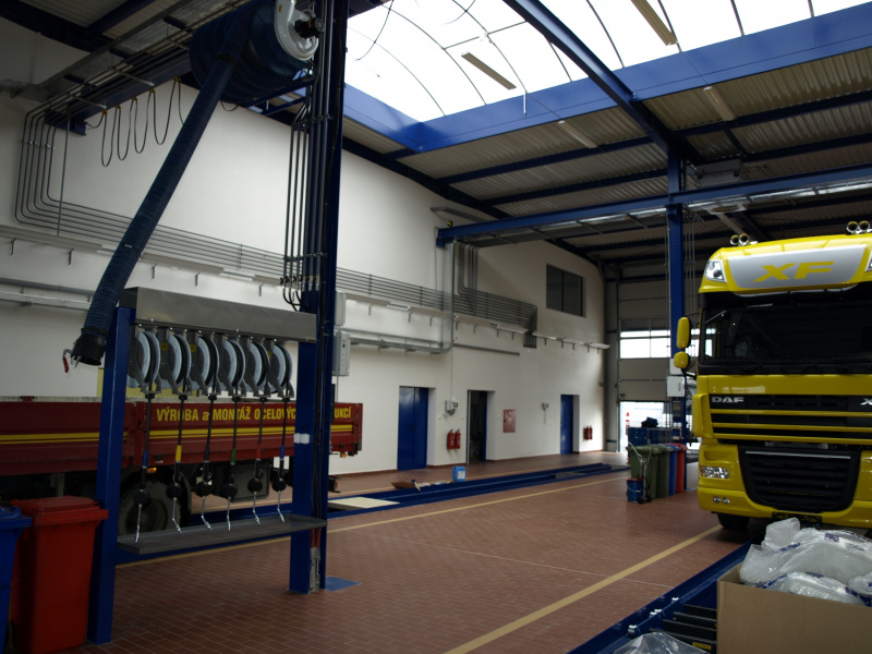 Ölwirtschaft für den Service von DAF-Lkw in Nýřany. Realisierung der Ausgabe neuer Öle an der Zapfsäule und in der Montagegrube. Absaugung von Altöl. Teil der Lieferung war auch die Installation einer Absaugleiste für Abgase.