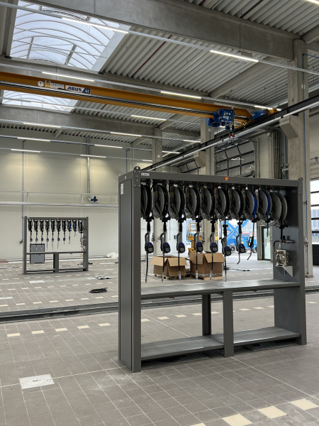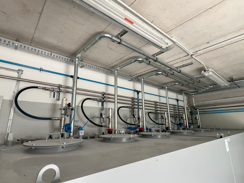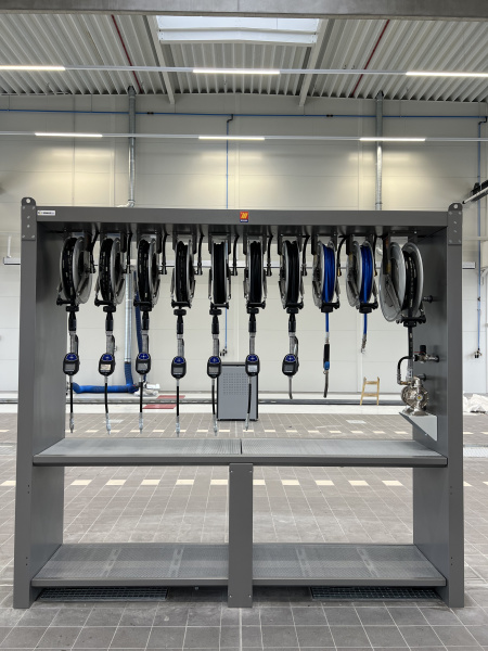 Für das neue Mercedes-Benz Truck Center Senec haben wir die komplette Ölwirtschaftstechnologie für die Ausgabe neuer Flüssigkeiten und die Sammlung von Altöl geliefert. Die Ausgabe neuer Flüssigkeiten erfolgt an zwei mit Aufrollvorrichtungen ausgestatteten Zapfsäulen in der Werkstatt und gleichzeitig in den Wartungsgruben. Das Altöl wird von jeder Zapfsäule und aus den Montagegruben mit Hilfe einer Absaugleiste und in den Gruben mit Hilfe von Schiebewagen in einen zentralen unterirdischen Tank gesammelt. Die Lagerung neuer Flüssigkeiten erfolgt in mehrkammerigen Doppelwandtanks und die Lagerung von Altöl in einem unterirdischen Tank. Die Befüllung der Tanks erfolgt über einen Abfüllschrank an der Fassade des Gebäudes, der mit einer Elektronik mit Überfüllsicherung ausgestattet ist.