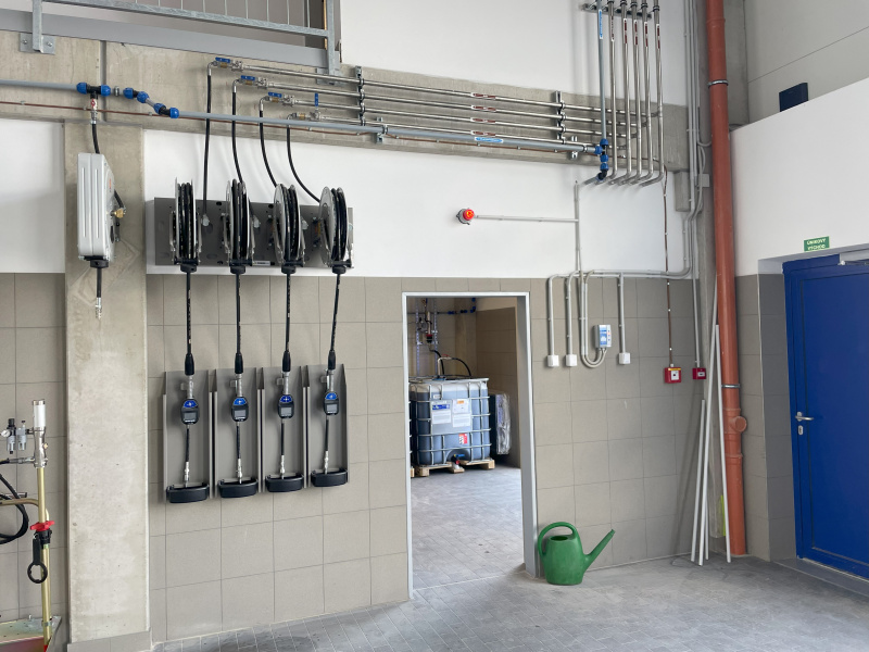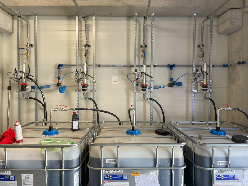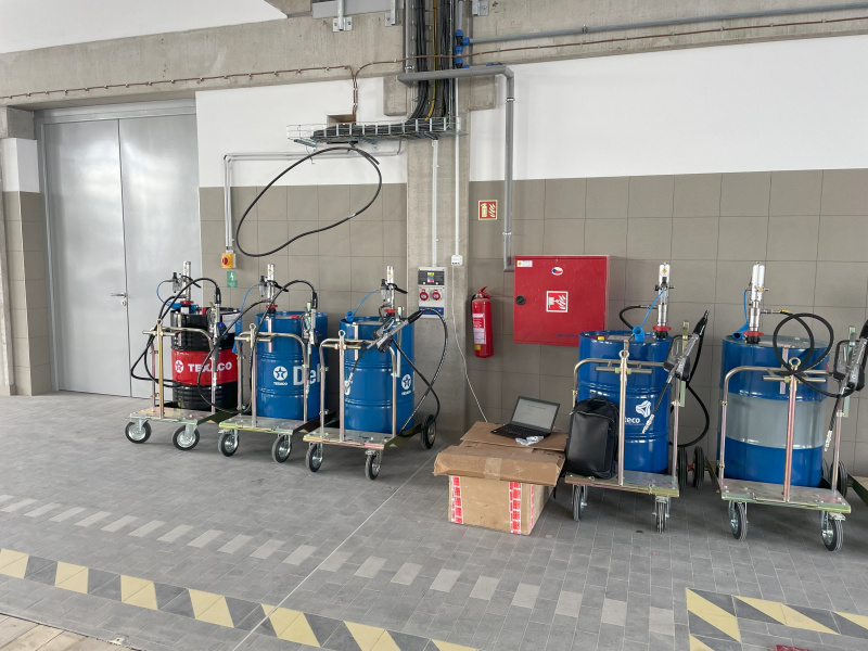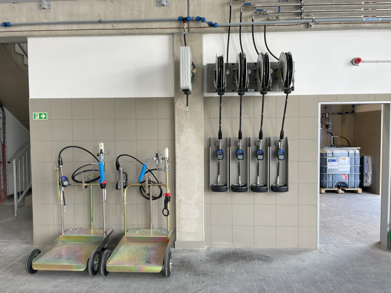 Ausstattung der Ölwirtschaft für das bedeutende Speditionsunternehmen Nikka Logistics. Die Ausgabe neuer Flüssigkeiten erfolgt sowohl an der Wand über Aufroller als auch auf mobilen Wagen, was durch das drahtlose Überwachungssystem Pulse Pro mit Anbindung an die Software SoftApp ermöglicht wird.